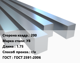 Квадрат стальной 200 Сталь: У8 L=1.75 г/к ГОСТ 2591-2006
