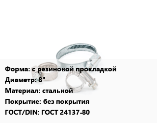 Хомут с резиновой прокладкой D=8" стальной без покрытия ГОСТ: ГОСТ 24137-80
