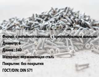 Шуруп с потайной головкой, с крестообразным шлицем 6х140 нержавеющая сталь без покрытия ГОСТ: DIN 571