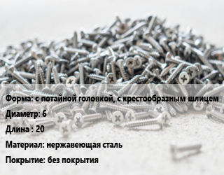 Шуруп с потайной головкой, с крестообразным шлицем 6х20 нержавеющая сталь без покрытия, упаковка 100 шт цена от 154.51 Р / кг, где купить, условия доставки в Гомеле и Гомельской области