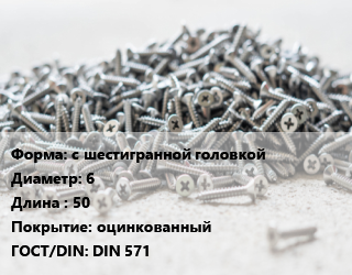 Шуруп с шестигранной головкой 6х50 оцинкованный ГОСТ: DIN 571, кг, Китай цена от 281.49 Р / кг, где купить, условия доставки в Гомеле и Гомельской области