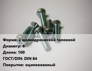 Винт с цилиндрической головкой 6х100 DIN 84 оцинкованный, цена за шт, кг цена от 27.9 Р / кг, где купить, условия доставки в Гомеле и Гомельской области