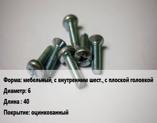 Винт мебельный, с внутренним шест., с плоской головкой 6х40 оцинкованный