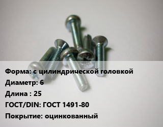 Винт с цилиндрической головкой 6х25 ГОСТ 1491-80 оцинкованный