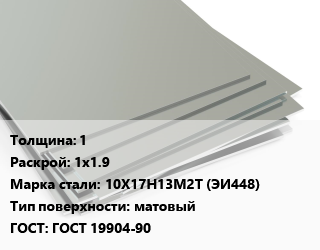 Лист нержавеющий 1 1х1.9 Сталь: 10Х17Н13М2Т (ЭИ448) Тип:матовый ГОСТ 19904-90