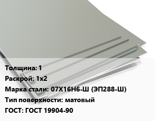 Лист нержавеющий 1 1х2 Сталь: 07Х16Н6-Ш (ЭП288-Ш) Тип:матовый ГОСТ 19904-90