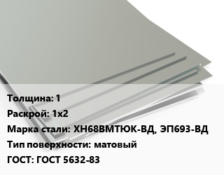 Лист нержавеющий 1 1х2 Сталь: ХН68ВМТЮК-ВД, ЭП693-ВД Тип:матовый ГОСТ 5632-83