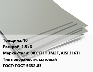 Лист нержавеющий 10 1.5х6 Сталь: 08Х17Н13М2Т, AISI 316Ti Тип:матовый ГОСТ 5632-83