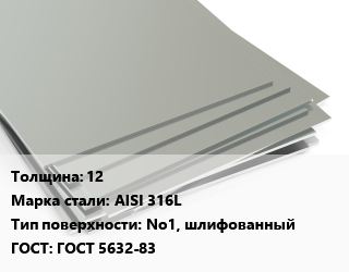 Лист нержавеющий 12 Сталь: AISI 316L Тип:No1, шлифованный ГОСТ 5632-83