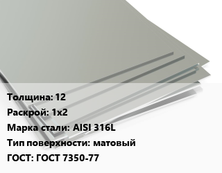 Лист нержавеющий 12 1х2 Сталь: AISI 316L Тип:матовый ГОСТ 7350-77, г/к, по запросу цена от 451 280 Р / т, где купить, условия доставки в Гомеле и Гомельской области