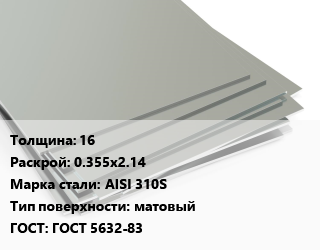 Лист нержавеющий 16 0.355х2.14 Сталь: AISI 310S Тип:матовый ГОСТ 5632-83