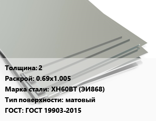 Лист нержавеющий 2 0.69х1.005 Сталь: ХН60ВТ (ЭИ868) Тип:матовый ГОСТ 19903-2015