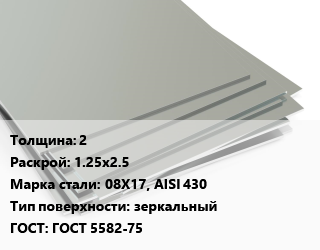 Лист нержавеющий 2 1.25х2.5 Сталь: 08Х17, AISI 430 Тип:зеркальный ГОСТ 5582-75