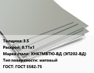 Лист нержавеющий 3.5 0.71х1 Сталь: ХН67МВТЮ-ВД (ЭП202-ВД) Тип:матовый ГОСТ 5582-75