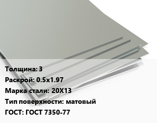 Лист нержавеющий 3 0.5х1.97 Сталь: 20Х13 Тип:матовый ГОСТ 7350-77