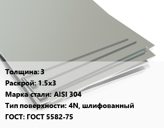 Лист нержавеющий 3 1.5х3 Сталь: AISI 304 Тип:4N, шлифованный ГОСТ 5582-75