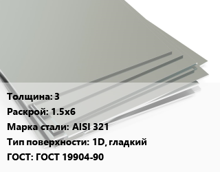 Лист нержавеющий 3 1.5х6 Сталь: AISI 321 Тип:1D, гладкий ГОСТ 19904-90