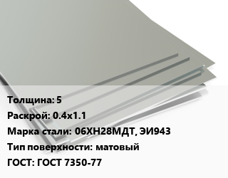 Лист нержавеющий 5 0.4х1.1 Сталь: 06ХН28МДТ, ЭИ943 Тип:матовый ГОСТ 7350-77