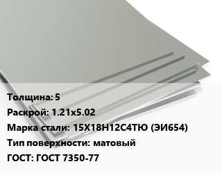 Лист нержавеющий 5 1.21х5.02 Сталь: 15Х18Н12С4ТЮ (ЭИ654) Тип:матовый ГОСТ 7350-77