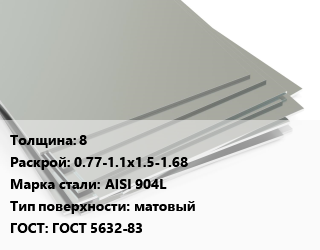 Лист нержавеющий 8 0.77-1.1х1.5-1.68 Сталь: AISI 904L Тип:матовый ГОСТ 5632-83