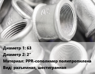 Муфта 63х2" PPR-сополимер полипропилена разъемная, шестигранная, шт цена от 559.33 Р / шт, где купить, условия доставки в Гомеле и Гомельской области