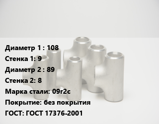 Тройник стальной 108х9 -89х8 Сталь: 09г2с без покрытия ГОСТ: ГОСТ 17376-2001